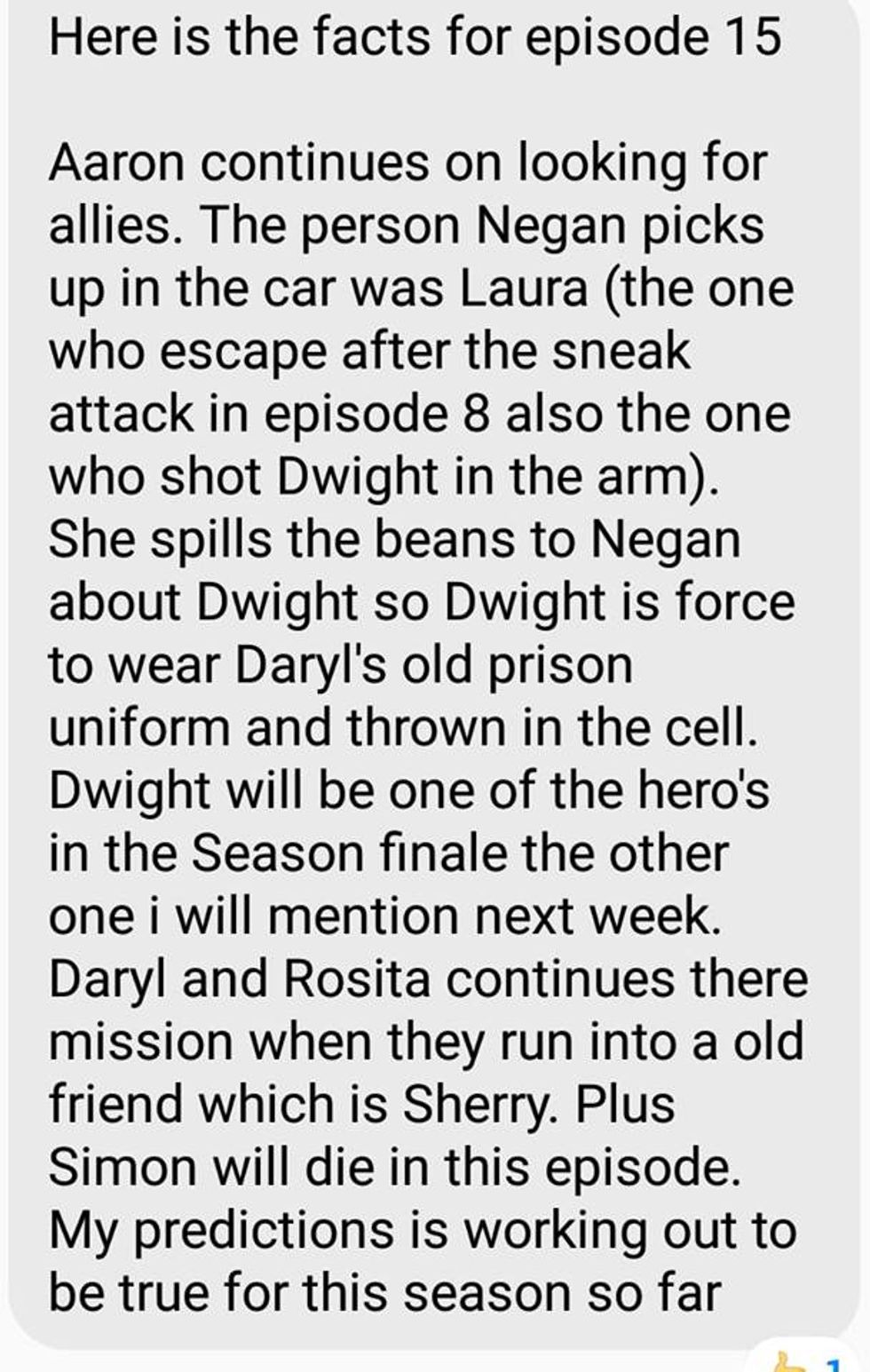 As for Dwight’s fate, there’s no solid answer, but ShinyFirefly's source did mention that, while his cover is blown by Laura, he doesn’t get a date with Lucille. Instead, he’s given the Daryl Dixon treatment: forced to wear Dixon’s old prison garb and live in the same cell. If this is the case, it appears to be a surprising act of mercy on Negan’s part considering this is the second time Dwight disappointed the Sanctuary leader. Then again, Negan's actions are never random and chances are he has a plan for the traitor.