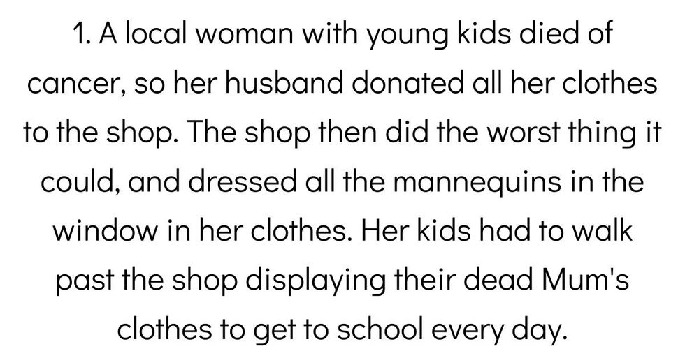A local woman with young kids died of cancer, so her husband donated all her clothes to the shop. The shop then did the worst thing it could, and dressed all the mannequins in the window in her clothes. Her kids had to walk past the shop displaying their dead Mum's clothes to get to school every day.