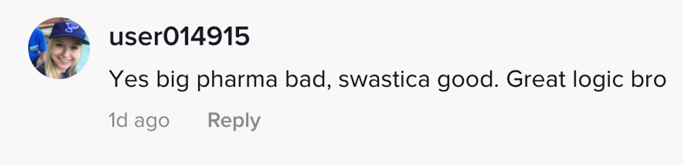 User @imnotcryingshutup posted a video of herself approaching a group of people with various anti-vaccine protest symbols, only to find someone else already confronting the person holding the swastika.