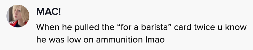 "I would if I cared," he said and proceeded to casually insult her intelligence with, "You use big words for being a barista."