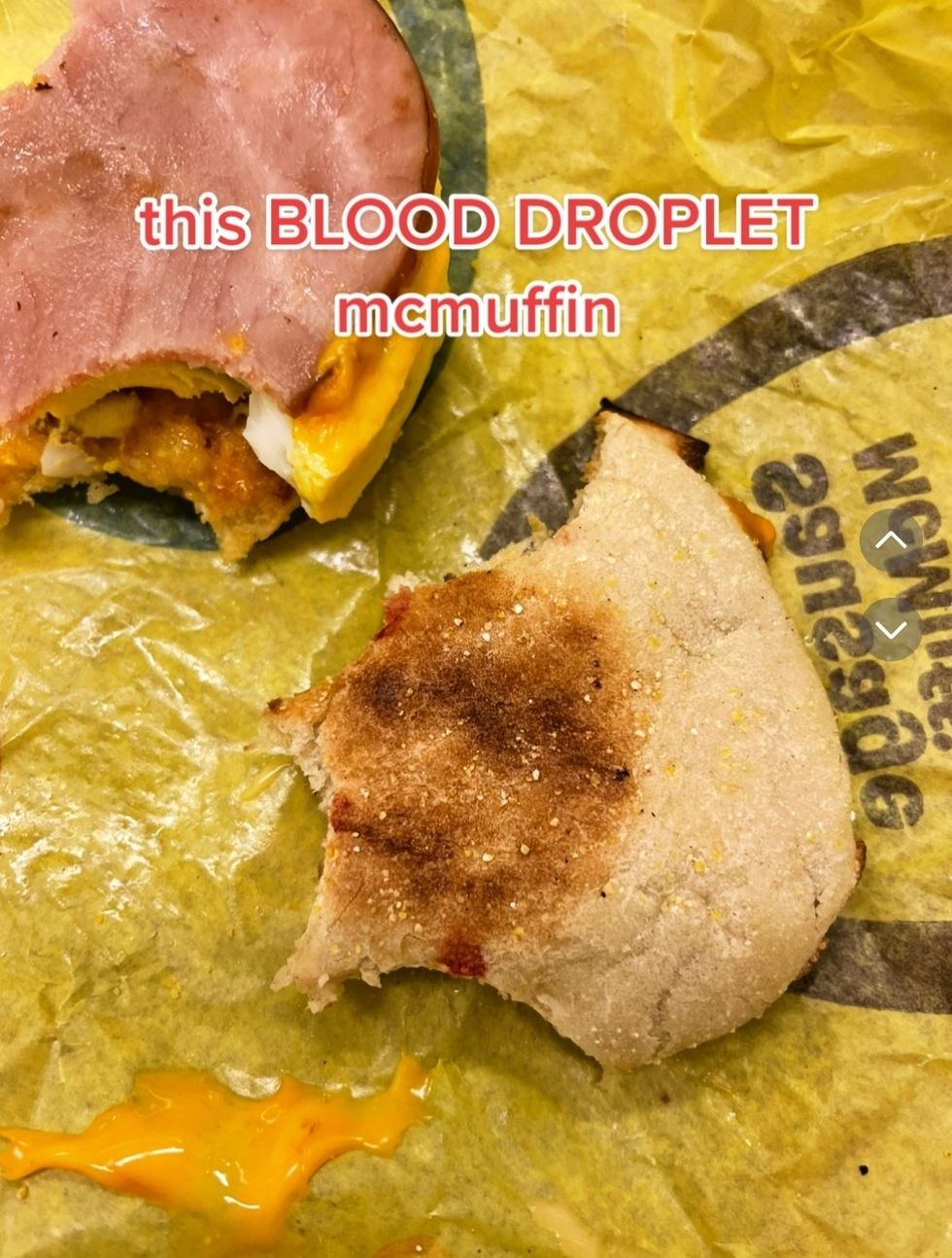TikToker Kira—@kiralles—made an image file saying she was served a "blood droplet mcmuffin" at McDonald's.