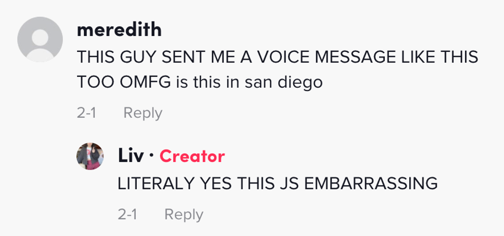 Liv, also known as user @loveiloveiloveolivia, received a voice memo from a man named Bradley following a brief exchange where she called him out for opening up the conversation with a backhanded compliment.