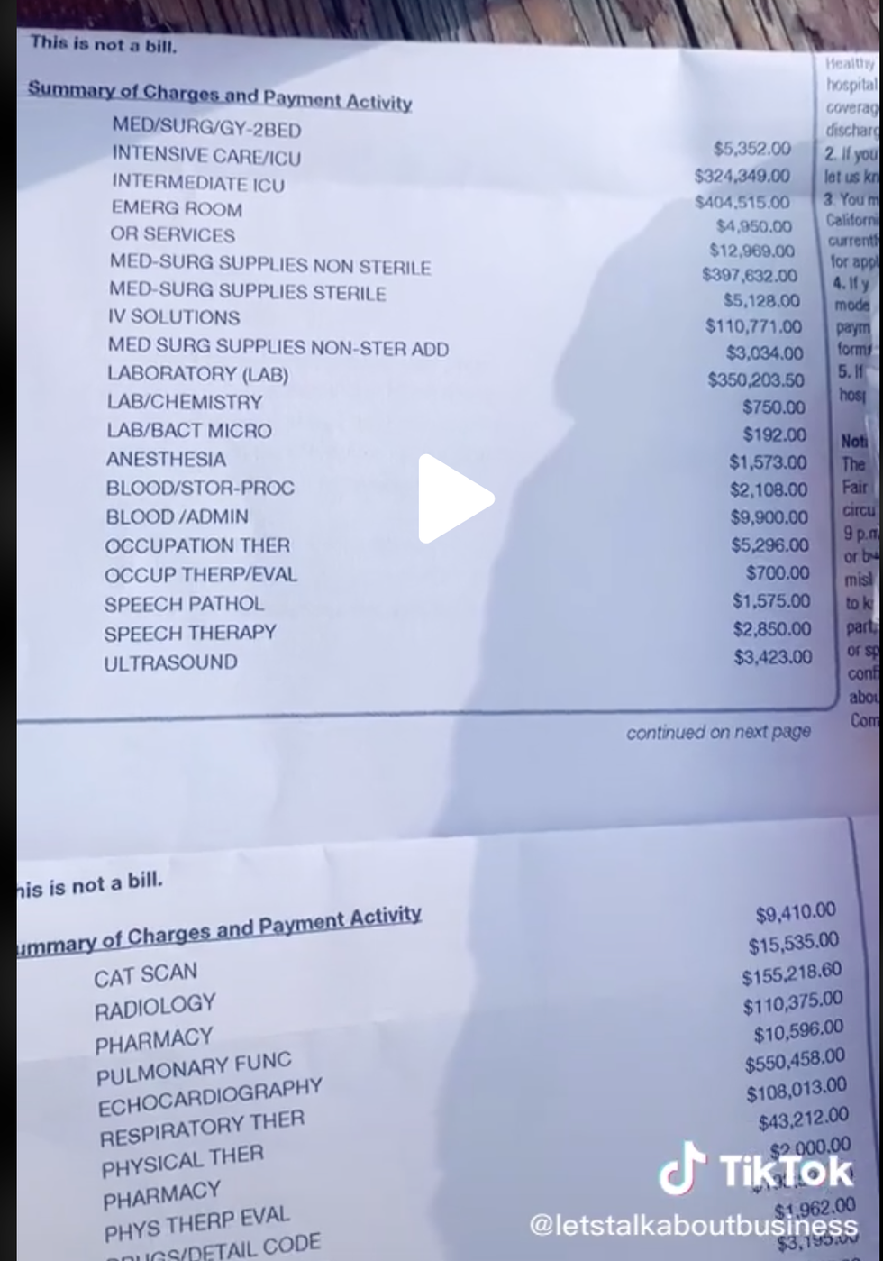 Posted by the @letstalkaboutbusiness TikTok account, the clip showed the hospital stay medical costs totaling nearly three million dollars.