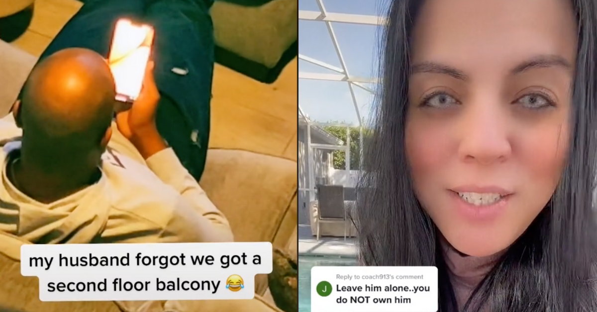 This is the question TikToker @lyjones0 sparked when she posted a video of herself spying her husband scrolling through thirst-trappy videos on TikTok from her interior second floor balcony.