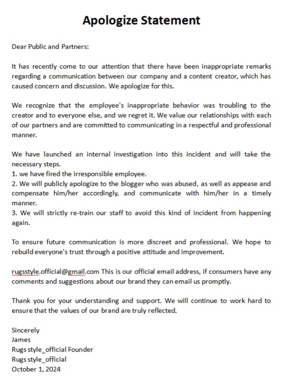 The PR disaster led to Rugsstyle's official founder, a person named "James," informing the public and partners of the company launching an internal investigation into the incident which led to the firing of the "irresponsible employee."