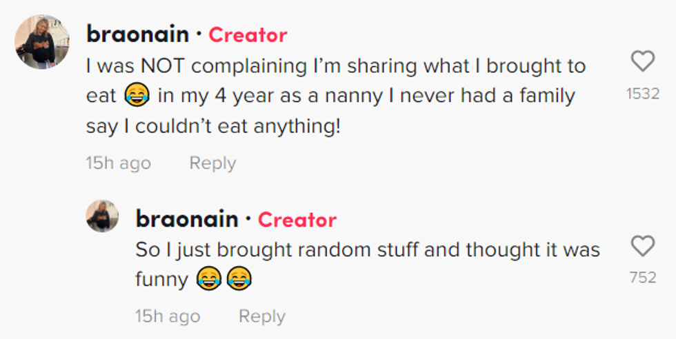 The nanny, who goes by braonain—@braonain1—on TikTok, posted a video as a joke, depicting the random assortment of foods she brought with her for her job, since her current employer forbade her from eating their food.