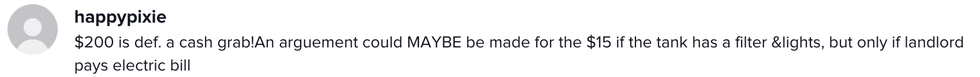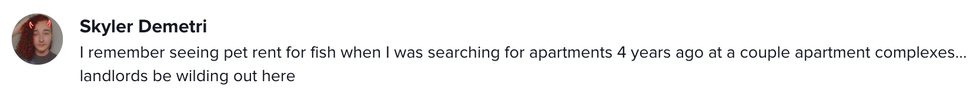 In her video - which has been viewed more than 64 thousand times over the course of a week - @nicr__ shared a photo of the fees accrued by her fish broken down on her statement. The screenshot of the breakdown shows that her apartment charged a one-time pet fee of $200 and $15 for monthly pet "rent," given it's not an "aggressive breed."