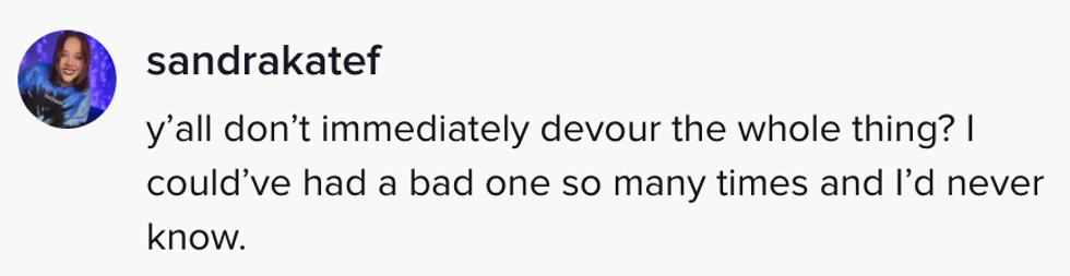 The clip showed Teabezel sitting with the cake pop on her thigh. And the split open pop was filled with small bits of blue mold.