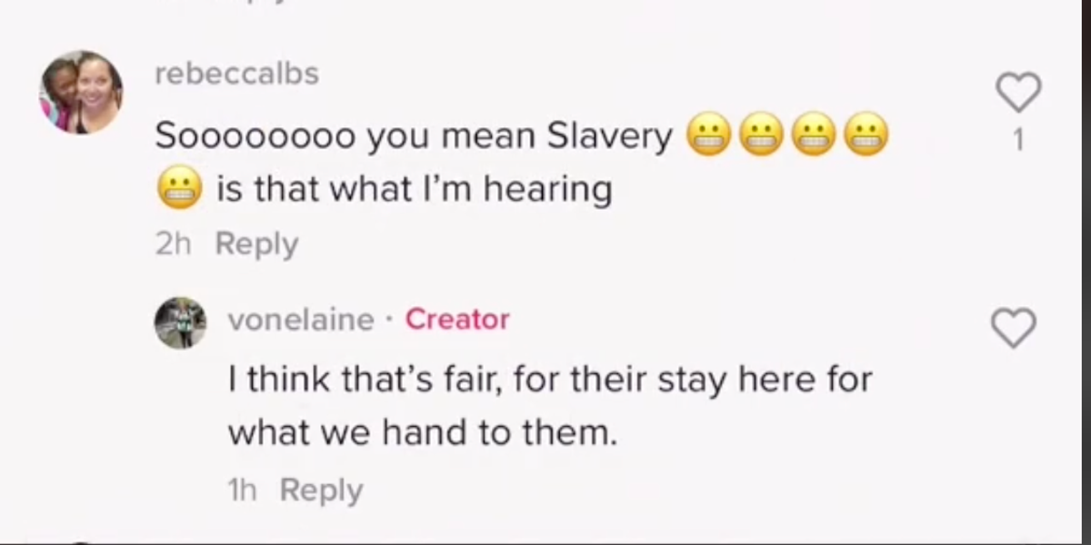 "I think you're asking for slavery back. Before you say, 'that's not what I'm saying,' because I know, I know how TikTok and White woman tears work, I know, but look what I found already."