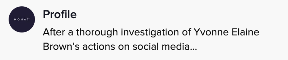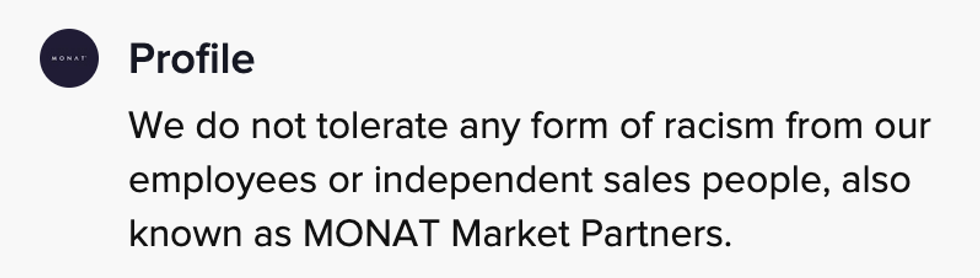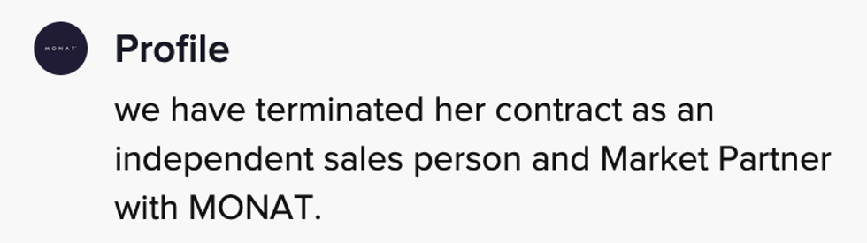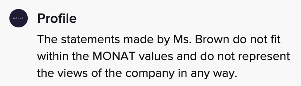 Monat commented on the post and indicated Brown has been terminated, citing the company does not tolerate "any form of racism from our employees or any independent sales people."