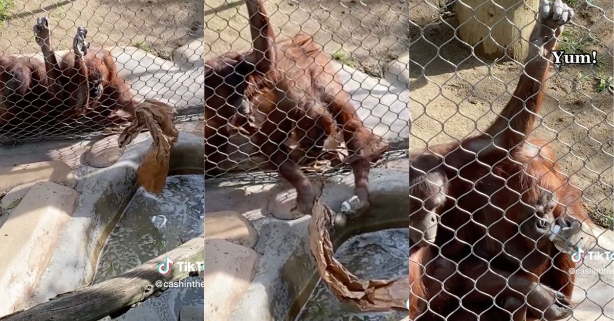 Before long, the organutan's gambit had worked—he got to the bottle before the zoo's employees could and got to work sampling the tasty treat inside Cruze's bottle.