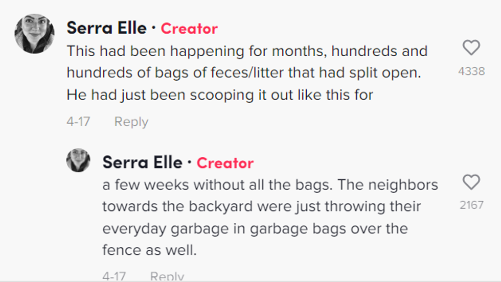 In a follow-up video, Elle continued her recording from the same day, showing her husband rush out into the yard to yell at the neighbor who was still up on his balcony after tossing the litter down into their yard.