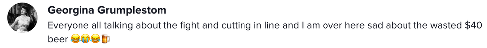 Finally, as the influencer walks away with her beers she cut in front of everyone to obtain, the lady in black pulls her hair hard from the back, making her spill beer everywhere. Incensed, the influencer then flings the rest of her beer at the lady in black.