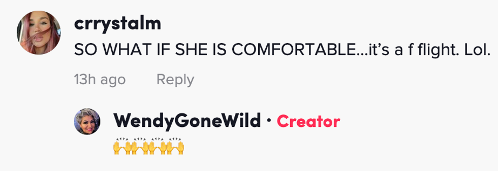 You see, Wendy likes to make herself at home on planes and she will make the most out of being sedentary for four hours, come hell or high water.