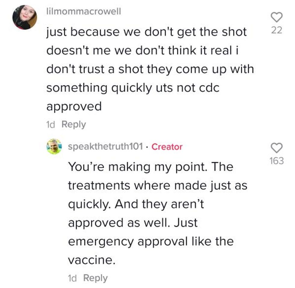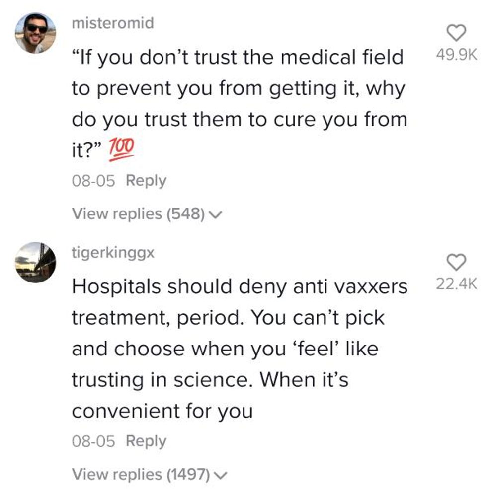 "What I am going to argue with you about is you running to the hospital once you get the virus. If you don't trust the medical field to prevent you from getting it, why do you trust them to cure you from it?"