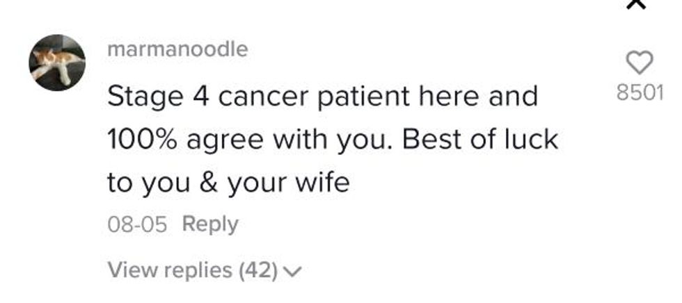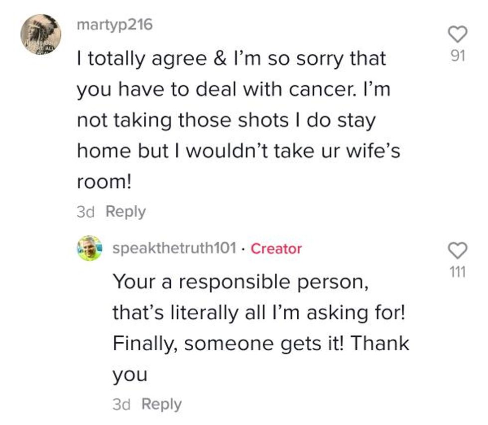 A North Carolina man whose wife is receiving treatment for stage-4 cancer made a TikTok video criticizing those who claimed to believe the pandemic was fake or who don't trust the vaccine, going to the hospital for treatment when they catch the virus.