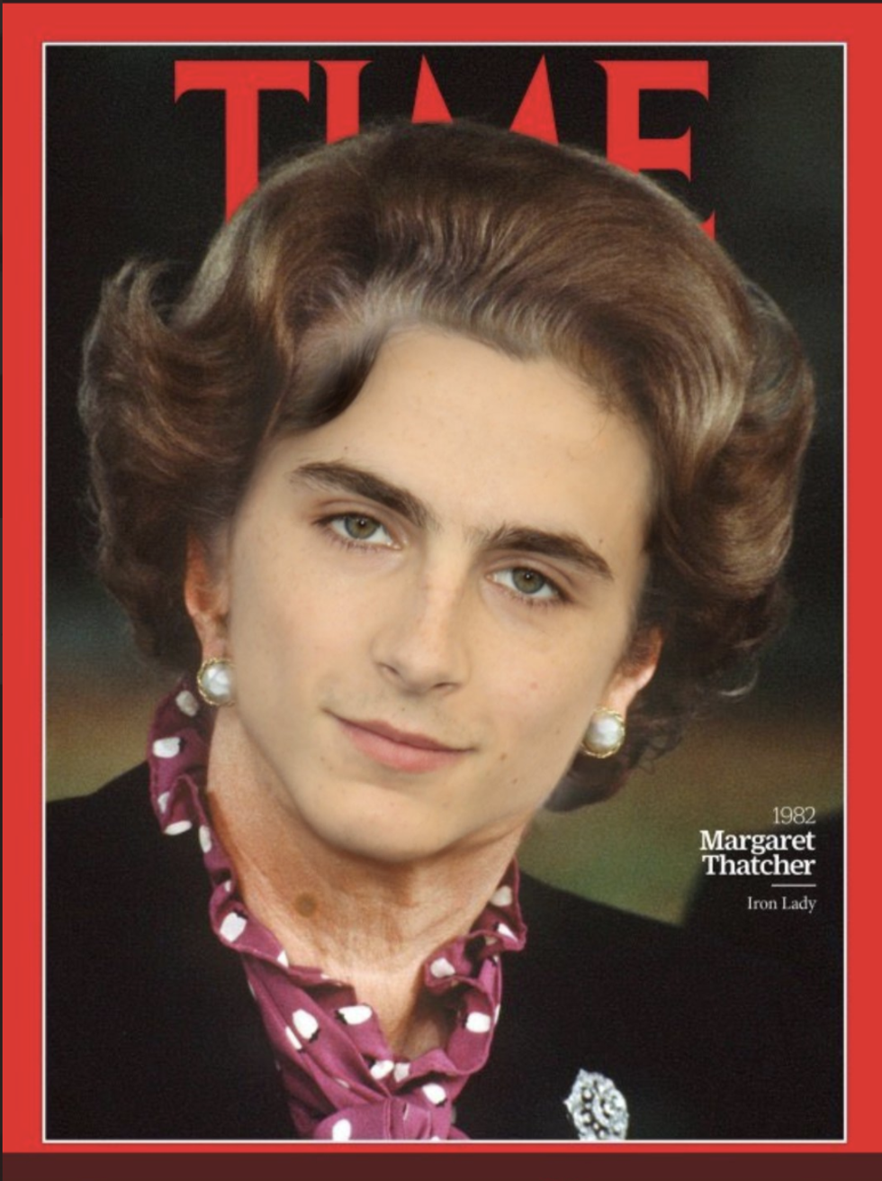 It's true! Our beautiful little French macaron shares a hairdo, a face shape, an eye shape and EVEN THAT BEAUTIFUL JAWLINE with the 71st Prime Minister of the United Kingdom, and Meryl's last Oscar-winning role herself, The "Iron Lady" Margaret Thatcher. (Thank God for Chalamet's more prominent chin or truly, all would be lost.)