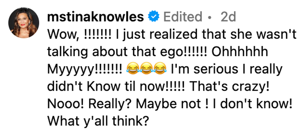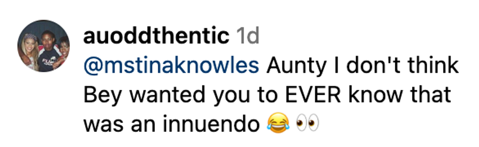 Beyoncé's mother, Tina Knowles, might've been the last person to discover that her daughter's 2009 single "Ego" had a NSFW meaning in the lyrics, and her reaction was pure.