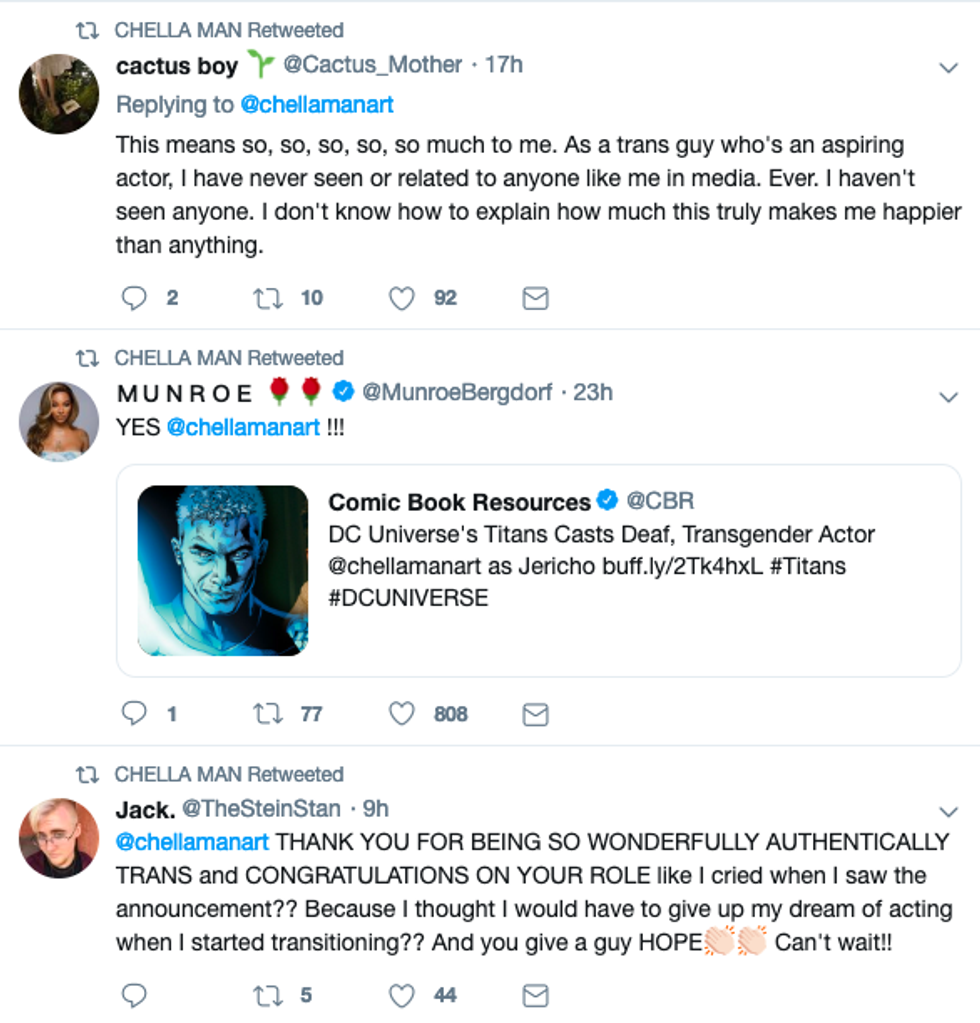 Chella Man, a deaf and transgender activist and artist, revealed he will be making his acting debut in a key role in Season 2 of Titans, playing the hero Jericho, the son of Deathstroke.