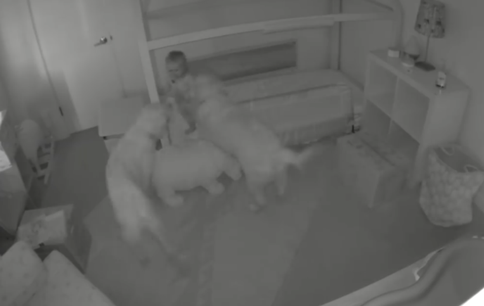 After the pair of pooches repeatedly reentered the room to check on Chloe's progress getting out of bed, she eventually made her escape out the door.
