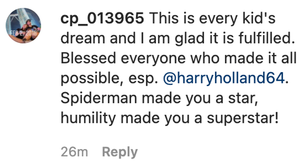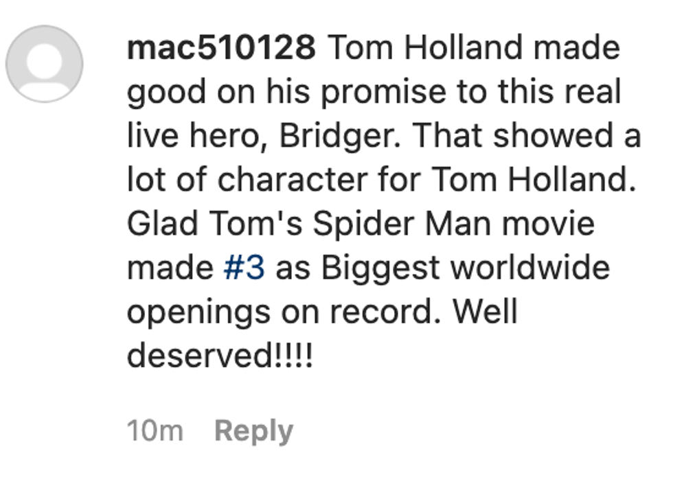 Several celebrities sent messages to Bridger but only Holland invited Bridger to do some real life superhero work.