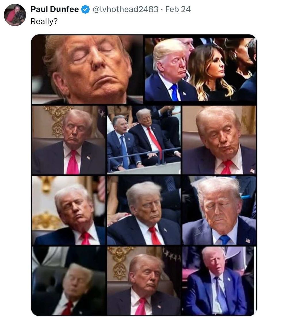 The POTUS has also been denying that he's been nodding off during cabinet meetings, important briefings, court hearings, or his Board of Peace meeting. Trump has given a variety of excuses for his eyes being closed.
