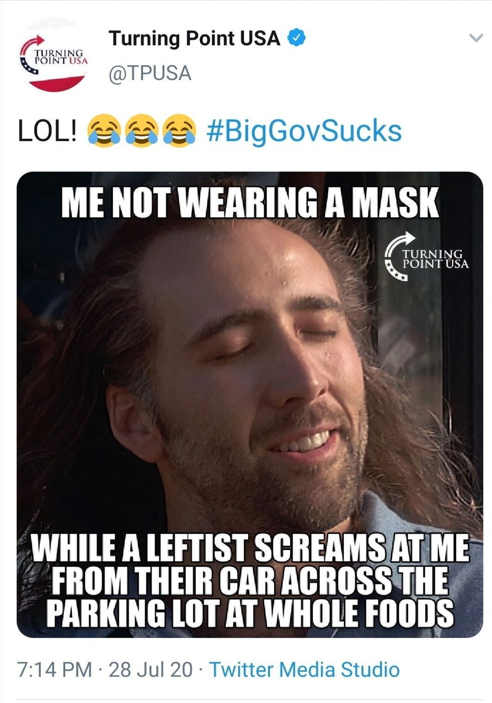 TP USA is a very vocal support organization for Trump and to that end did their own disinformation campaign to downplay the danger of the disease, and most importantly the efficacy of masks.