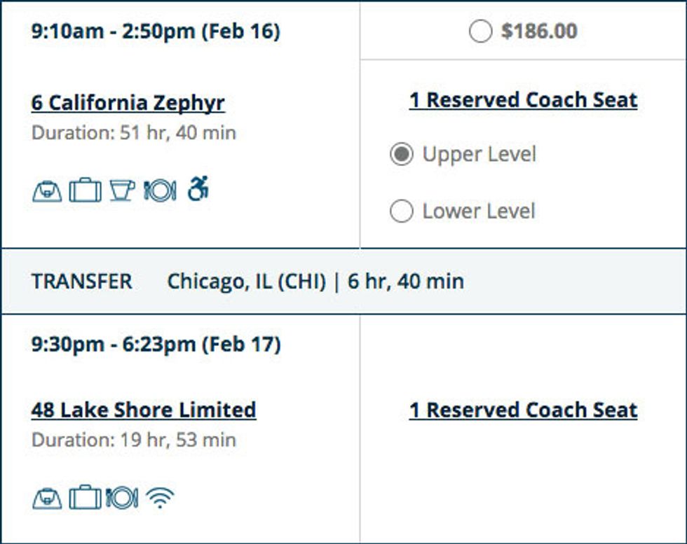 But, in truth, if your schedule is flexible and you don't mind riding coach, you can do it for much less. If you don't take any detours along the way, a straight shot on the California Zephyr costs only $186.