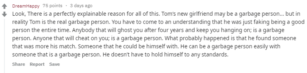 When she reached out to a friend about her ex's behavior, she was surprised to hear he told everyone they broke up. She added that her ex was cheating on her.
