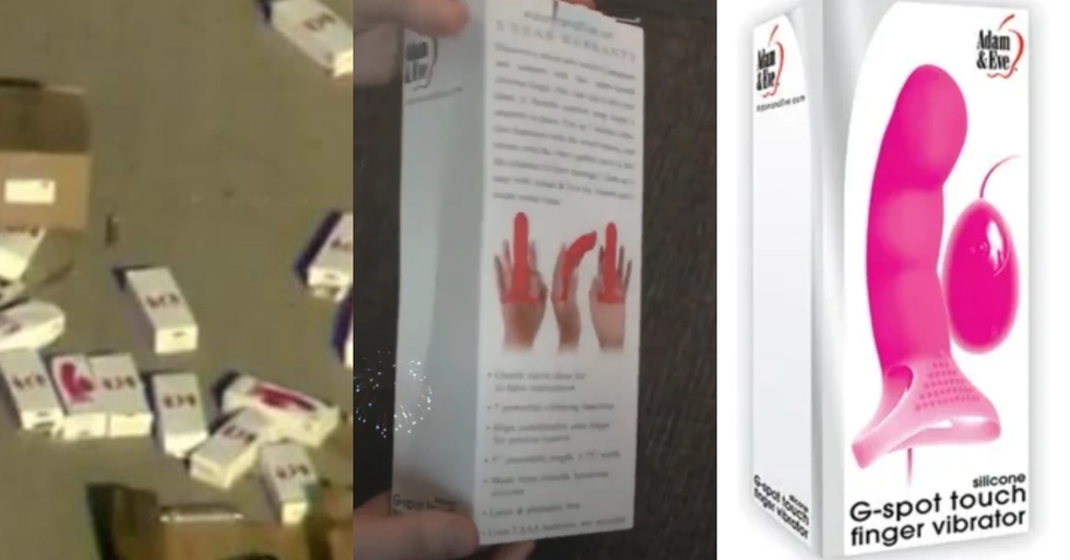 Vice News reported some appeared to match the packaging for the Adam & Eve brand G-Spot Touch Finger Vibe. Other items were tentatively identified as lube, vibrators and dildos.