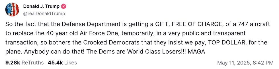 "So the fact that the Defense Department is getting a GIFT, FREE OF CHARGE, of a 747 aircraft to replace the 40 year old Air Force One, temporarily, in a very public and transparent transaction, so bothers the Crooked Democrats that they insist we pay, TOP DOLLAR, for the plane. Anybody can do that! The Dems are World Class Losers!!! MAGA"
