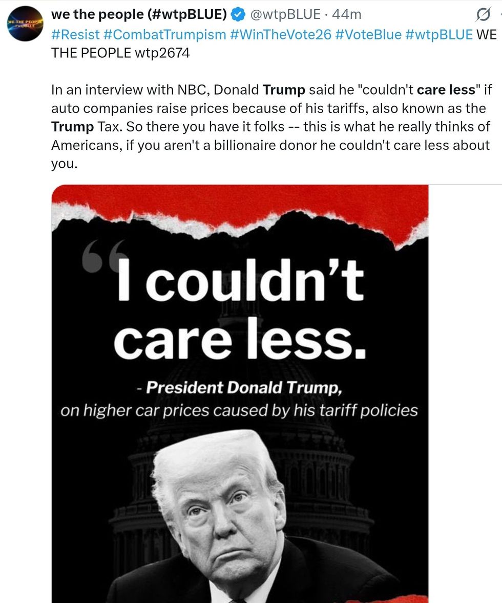 Hey, MAGAs! tRump’s comment that he “couldn’t care less” if car prices go up due to tariffs on imported vehicles proves once again his complete indifference to the well-being of average Americans.