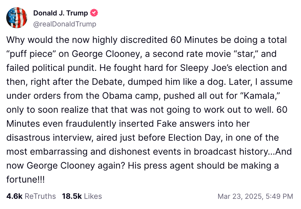 Following the March 23 airing of the 60 Minutes interview with Clooney, Trump took to his Truth Social platform to attack the press and Clooney, writing: