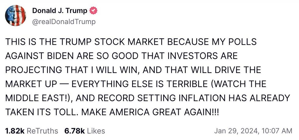 "THIS IS THE TRUMP STOCK MARKET BECAUSE MY POLLS AGAINST BIDEN ARE SO GOOD THAT INVESTORS ARE PROJECTING THAT I WILL WIN, AND THAT WILL DRIVE THE MARKET UP - EVERYTHING ELSE IS TERRIBLE (WATCH THE MIDDLE EAST!), AND RECORD SETTING INFLATION HAS ALREADY TAKEN ITS TOLL."