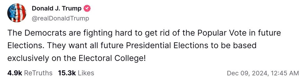 Now that Trump finally won the popular vote on his third try—having lost in both 2016 and 2020—he's baselessly acting as though Democrats are somehow hostile to the popular vote, which flies in the face of all objective reality.