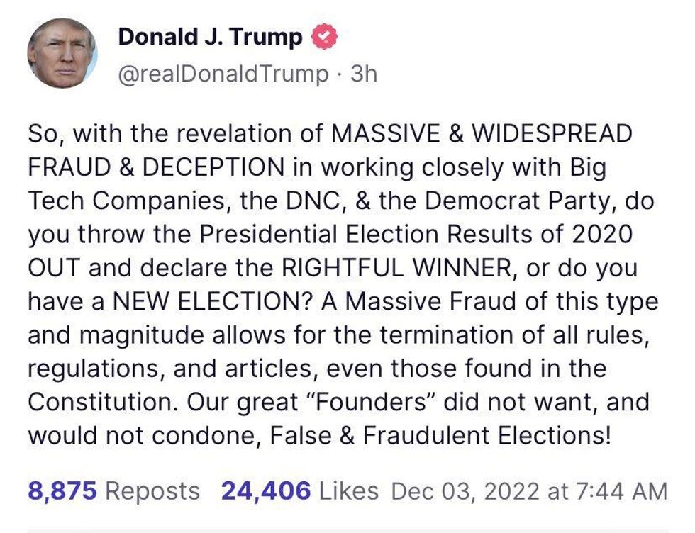 "So, with the revelation of MASSIVE & WIDESPREAD FRAUD & DECEPTION in working closely with Big Tech Companies, the DNC, & the Democrat Party, do you throw the Presidential Election Results of 2020 OUT and declare the RIGHTFUL WINNER, or do you have a NEW ELECTION?"