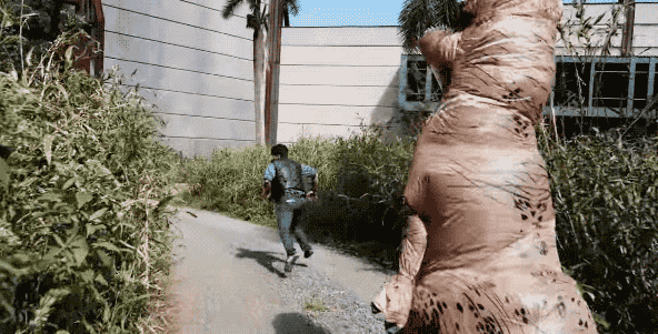 But then comes the moment when President Trump gets his first look at the dinosaur. And instead of a friendly reaction, he frowns and seems to size up the kid inside, staring directly at the mesh screen where the kid's face is as they walk by.