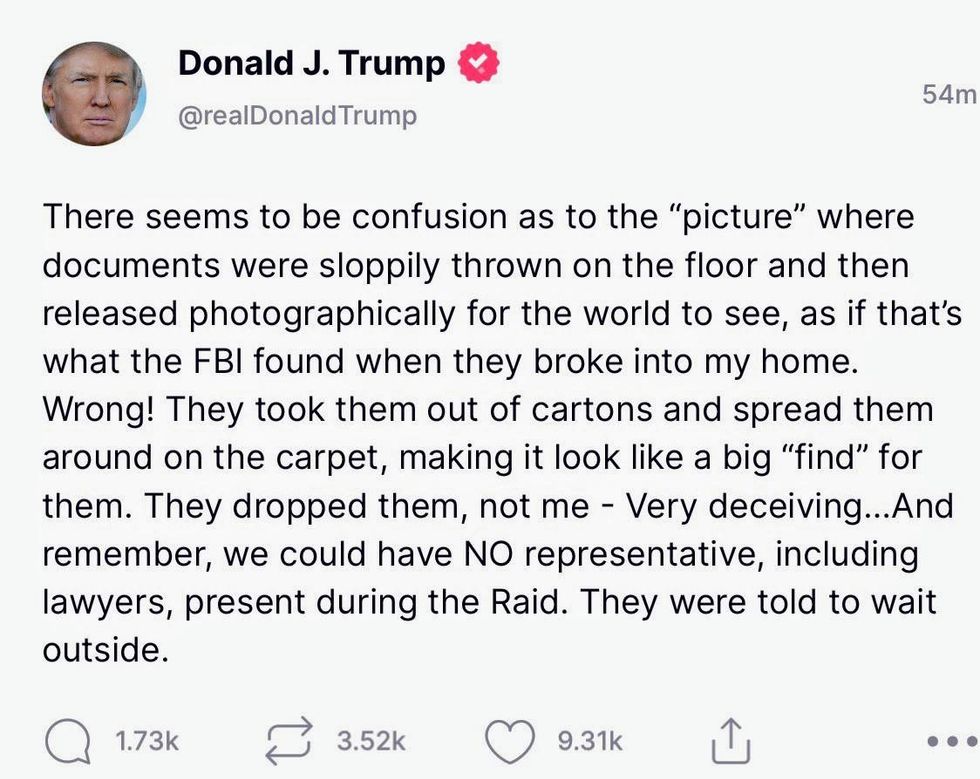 "There seems to be confusion as to the 'picture' where documents were sloppily thrown on the floor and then released photographically for the world to see, as if that's what the FBI found when they broke into my home."