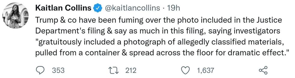\u201cThey took out the documents that our lawyers said we didn't have and took pictures of them.\u201d— Josh Dawsey (@Josh Dawsey) 1661983897