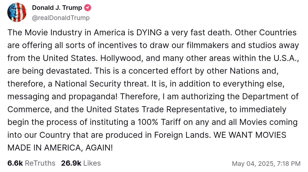 "Therefore, I am authorizing the Department of Commerce, and the United States Trade Representative, to immediately begin the process of instituting a 100% Tariff on any and all Movies coming into our Country that are produced in Foreign Lands."
