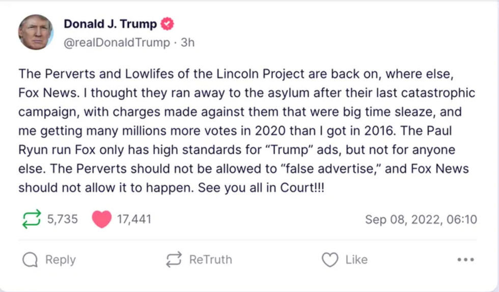 He attacked The Lincoln Project—which he suggested is run by "Perverts and Lowlifes"—as well as Fox News for airing the ad in the first place.