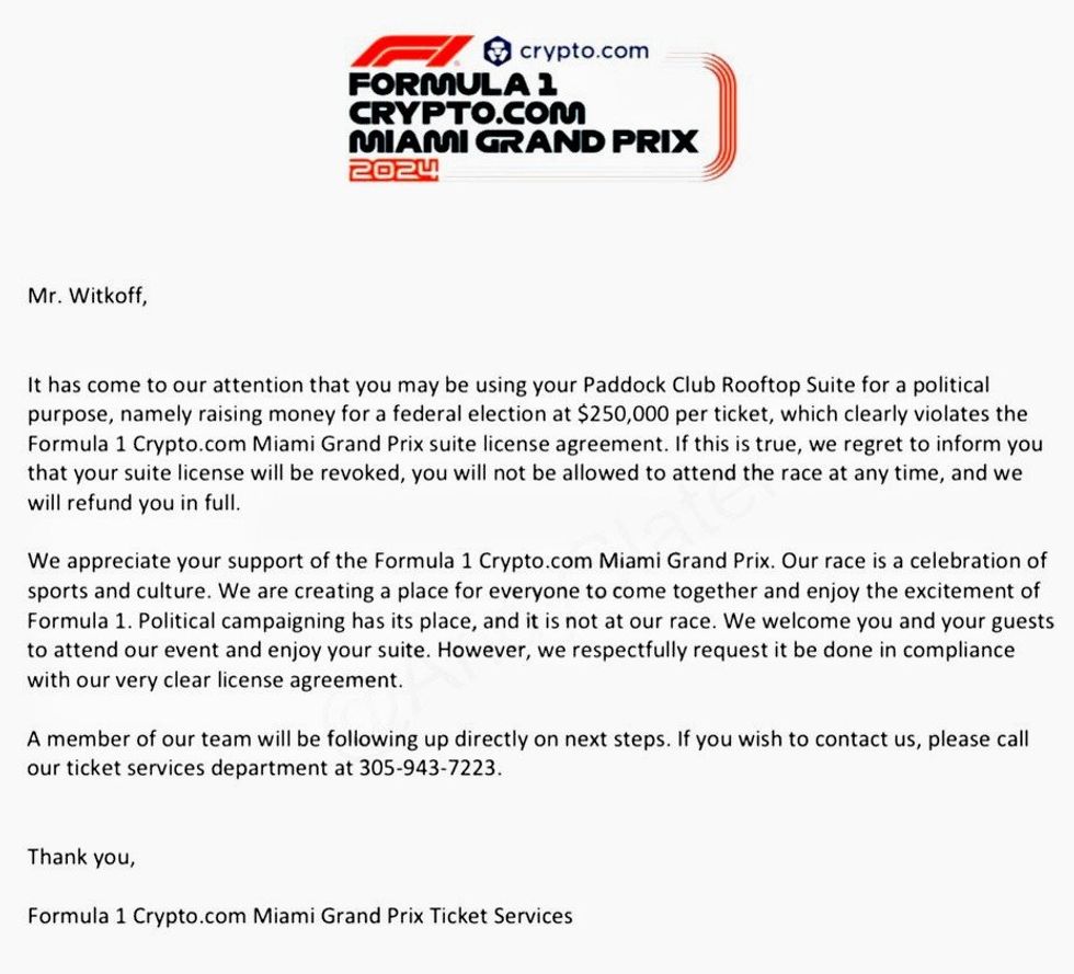 "It has come to our attention that you may be using your Paddock Club Rooftop Suite for a political purpose, namely raising money for a federal election at $250,000 per ticket, which clearly violates the Formula 1 Crypto.com Miami Grand Prix suite license agreement."