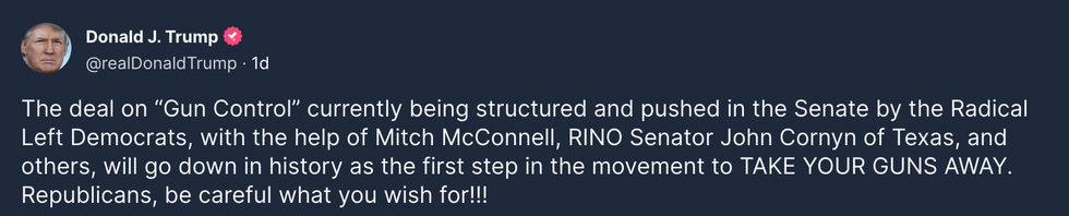 "The deal on G'un Control' currently being structured and pushed in the Senate by the Radical Left Democrats, with the help of Mitch McConnell, RINO Senator John Cornyn of Texas, and others, will go down in history as the first step in the movement to TAKE YOUR GUNS AWAY."