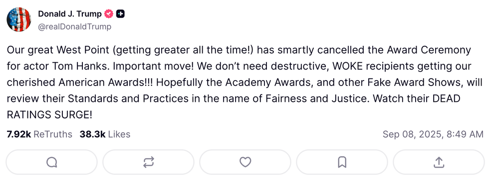 “Our great West Point (getting greater all the time!) has smartly cancelled the Award Ceremony for actor Tom Hanks. We don’t need destructive, WOKE recipients getting our cherished American Awards!!! Hopefully the Academy Awards, and other Fake Award Shows, will review their Standards and Practices in the name of Fairness and Justice. Watch their DEAD RATINGS SURGE!”