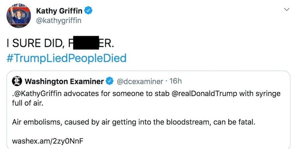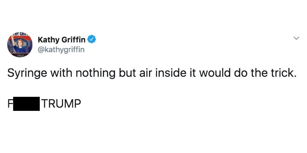 In response to a tweet from Jim Acosta, Griffin sugested the President should be injected with a syringe of air, a potential fatal procedure.
