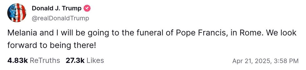 "Melania and I will be going to the funeral of Pope Francis, in Rome. We look forward to being there!"