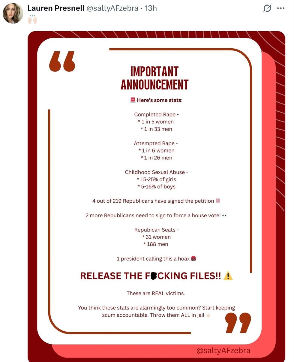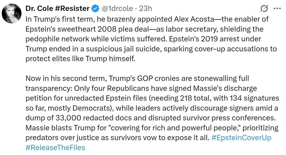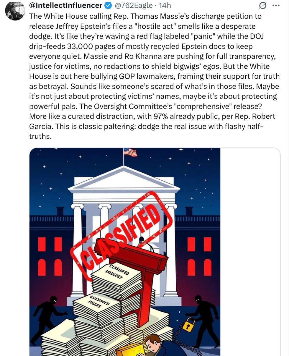"White House says helping me secure a vote to release all the Epstein files is a 'Hostile Act'."