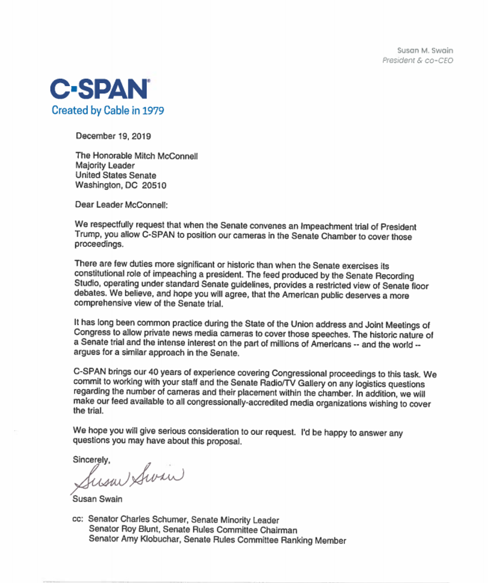 Now C-SPAN, America's public television network covering day-to-day events in all three branches of government, is coming forward with a letter it sent to McConnell on December 19, imploring him to allow their cameras to cover the trial.