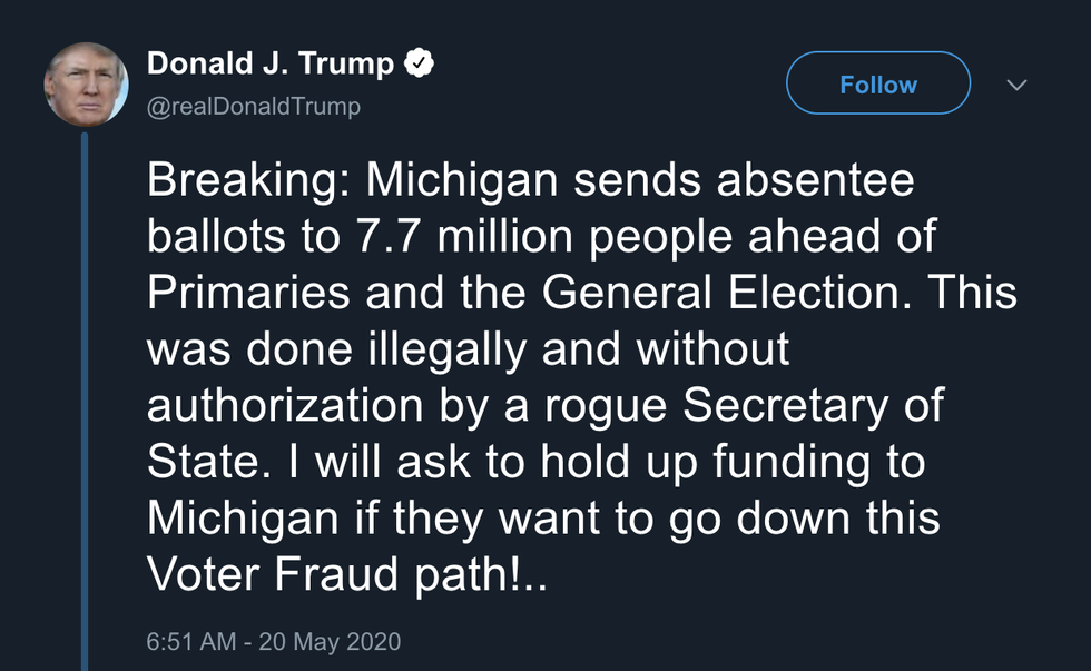 Trump deleted his original tweet, and posted a new one specifying that Michigan sent ballot applications, not actual ballots.