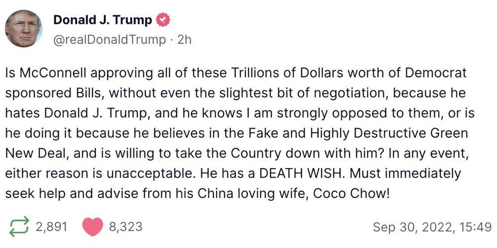 \u201cTrump's Truth Social DEATH WISH post about Mitch McConnell is yet another reason that Apple and Google shouldn't have it in their app stores https://t.co/B1E5lo7s3b\u201d— Citizens for Ethics (@Citizens for Ethics) 1664655017
